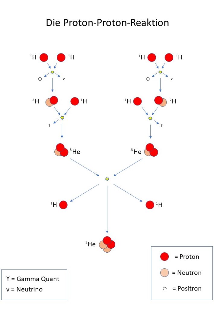 Durch die Druck und Temperaturverhältnisse im im Zentrum der Sonne – ca. 15 Millionen Kelvin – ist es möglich dass sich zwei Protonen, obwohl sie sich durch ihre positive Ladung eigentlich abstossen, so nahe kommen dass eines der Protonen seine Ladung abgibt und sich unter Abstrahlung von einem Positron und einem Neutrino in ein Neutron verwandelt. Diesen Vorgang nennt man Beta-Zerfall. Es entsteht Deuterium (auch schwerer Wasserstoff genannt) also ein Atomkern der aus einem Proton und einem Neutron besteht. Bei einer weiteren Verschmelzung mit einem Proton entsteht unter Abstrahlung von einem Gamma-Quant ein Helium3 Kern (2 Protonen und 1 Neutron). Verschmelzen nun zwei solche Helium3 Kerne entsteht Helium4 (2 Protonen und 2 Neutronen) und zwei Protonen werden wieder frei.