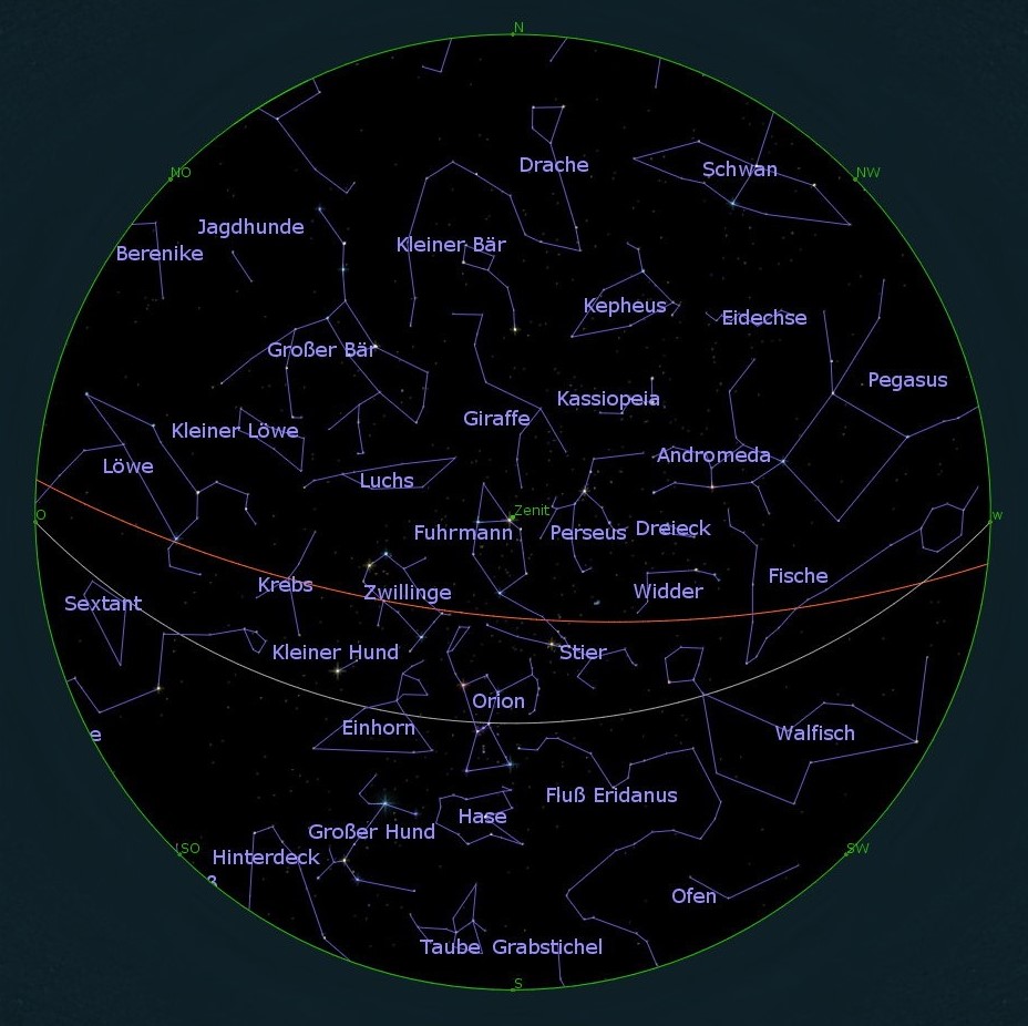 Im Stier zieht der helle Jupiter die Blicke auf sich, weiter westlich ist Uranus ein Fernglasobjekt. Im Südosten bildet der rötliche Mars mit Castor und Pollux in den Zwillingen derzeit eine Linie.